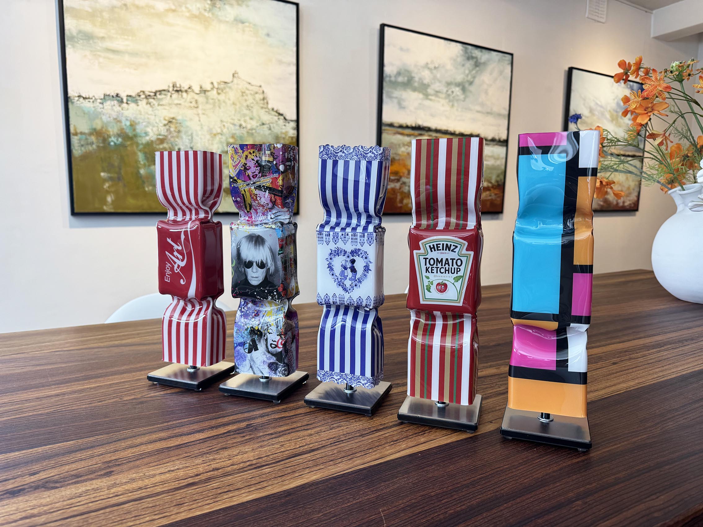De "Art Candy Toffee - Homage to Piet Mondriaan" is vervaardigd uit liquid gloss, wat zorgt voor een schitterend hoogglans effect. Het beeld staat stevig op een roestvrijstalen sokkel, waardoor het een moderne en duurzame uitstraling heeft. Met een hoogte van 33 cm is dit kunstwerk een opvallende toevoeging aan elk interieur.
