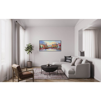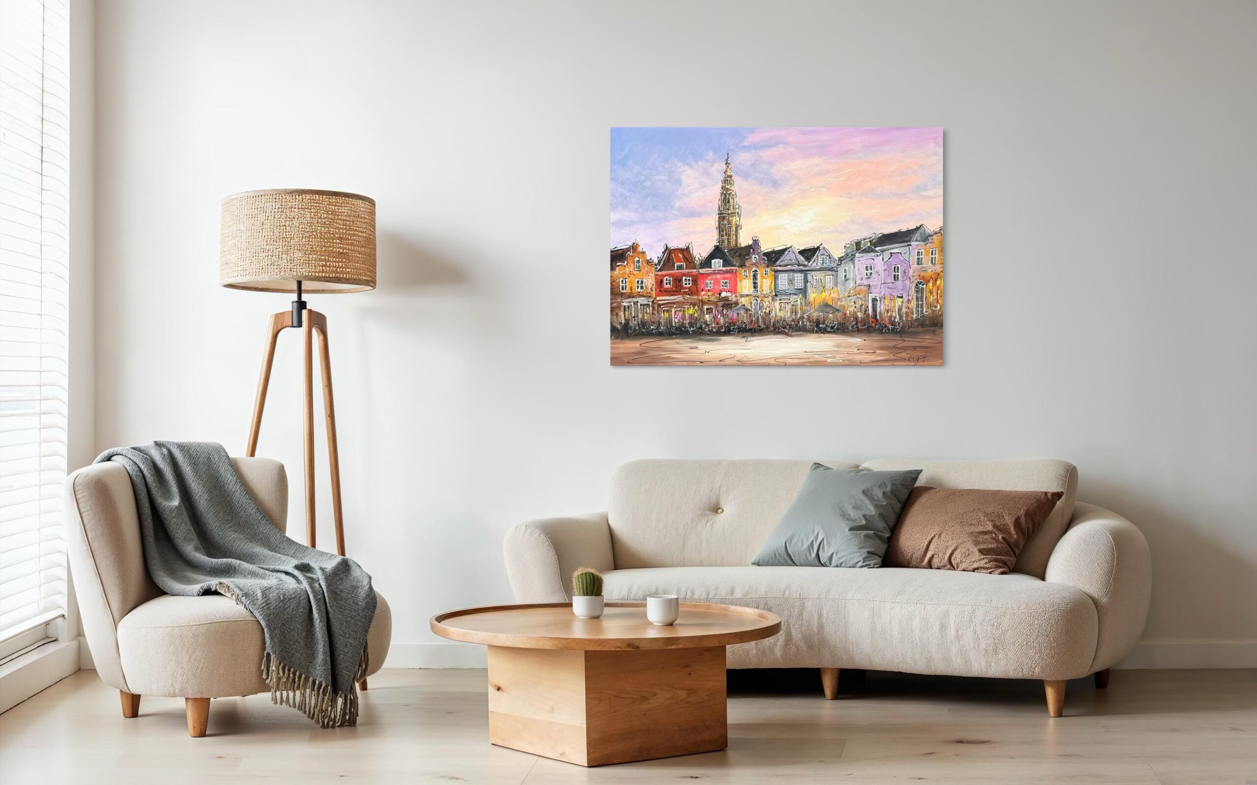 Prachtig en groot schilderij van een van de mooiste pleinen in Amersfoort. Een vrije interpretatie van de getalenteerde Caspar van Houten. Dit unieke kunstwerk, met een vierkant formaat van 100 x 140cm, is geschilderd op hoogwaardig linnen. De zijkanten zijn meegeschilderd voor een strakke, naadloze look. Dankzij het ophangsysteem hangt het schilderij in een handomdraai aan je muur. Wil je een extra stijlvolle presentatie? Kies dan voor bijvoorbeeld een elegante zwarte baklijst.