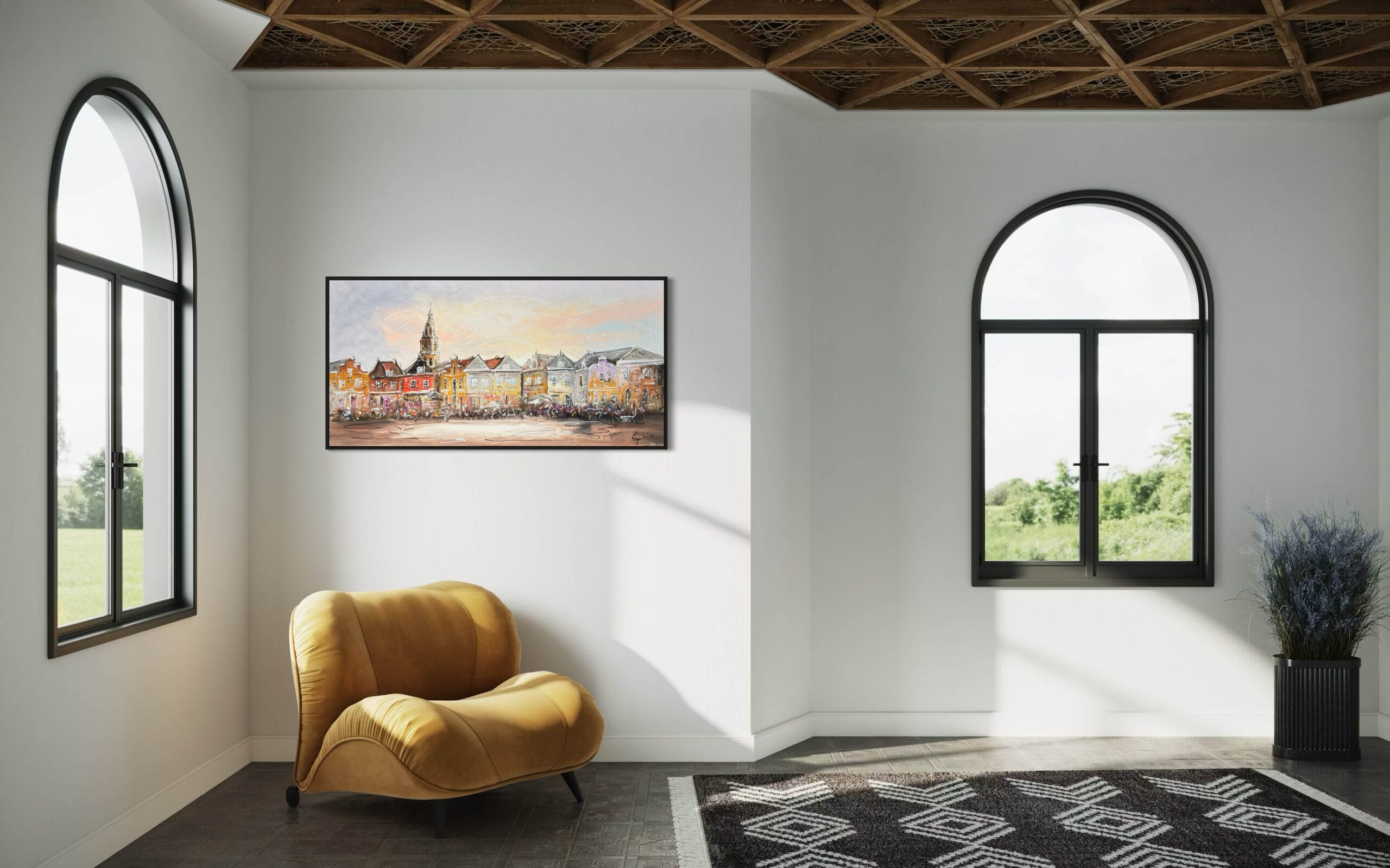 Caspar van Houten heeft een geweldig schilderij gemaakt van één van de mooiste pleinen in Amersfoort: de Hof. Dit unieke kunstwerk, met een fraai liggend formaat van 70 x 140 cm, is geschilderd op hoogwaardig linnen. De zijkanten zijn meegeschilderd voor een strakke, naadloze look. Dankzij het ophangsysteem hangt het schilderij in een handomdraai aan je muur. Wil je een extra stijlvolle presentatie? Kies dan voor bijvoorbeeld een elegante zwarte baklijst, laat je hiervoor gerust adviseren. In de galerie hebben we een ruime collectie (bak)lijsten.