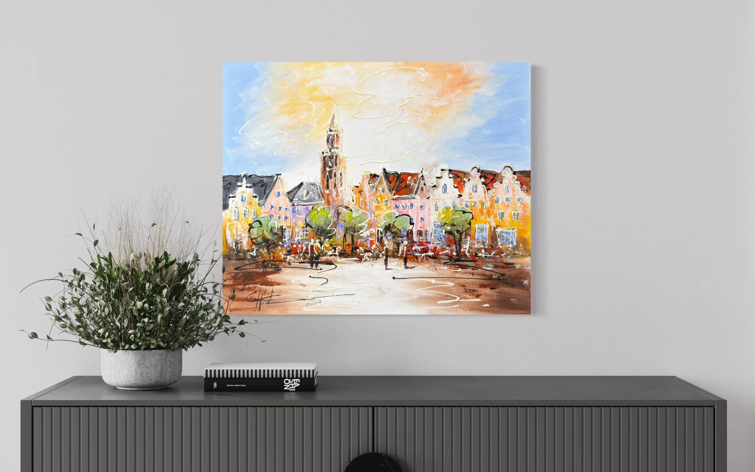 Caspar van Houten heeft een prachtig schilderij gemaakt van De Hof in Amersfoort. Dit unieke kunstwerk, met een formaat van 50 x 60 cm, is geschilderd op hoogwaardig linnen. De zijkanten zijn meegeschilderd voor een strakke, naadloze look. Dankzij het ophangsysteem hangt het schilderij in een handomdraai aan je muur. Wil je een extra stijlvolle presentatie? Kies dan voor bijvoorbeeld een elegante zwarte baklijst, laat je hiervoor gerust adviseren. In de galerie hebben we een ruime collectie (bak)lijsten.