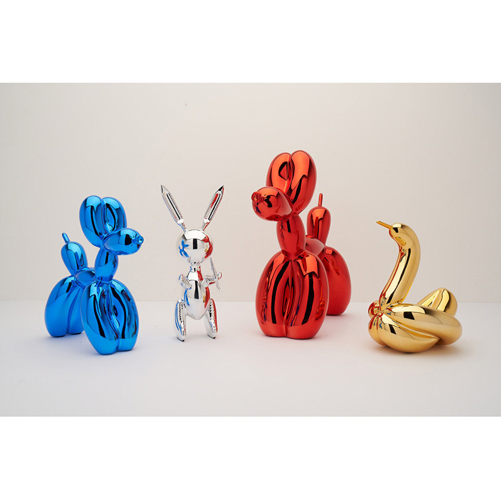 Jeff Koons, geboren in 1955 in York, Pennsylvania, is een van de meest invloedrijke en controversiële kunstenaars van de moderne tijd. Zijn Balloon Dog-serie, onderdeel van de Celebration-reeks uit 1994, heeft wereldwijd erkenning gekregen. De Balloon Dog-sculpturen zijn geïnspireerd door de eenvoudige ballonfiguren die vaak op kinderfeestjes te zien zijn, maar Koons heeft ze getransformeerd tot luxueuze kunstwerken van roestvrij staal met een spiegelende afwerking.
