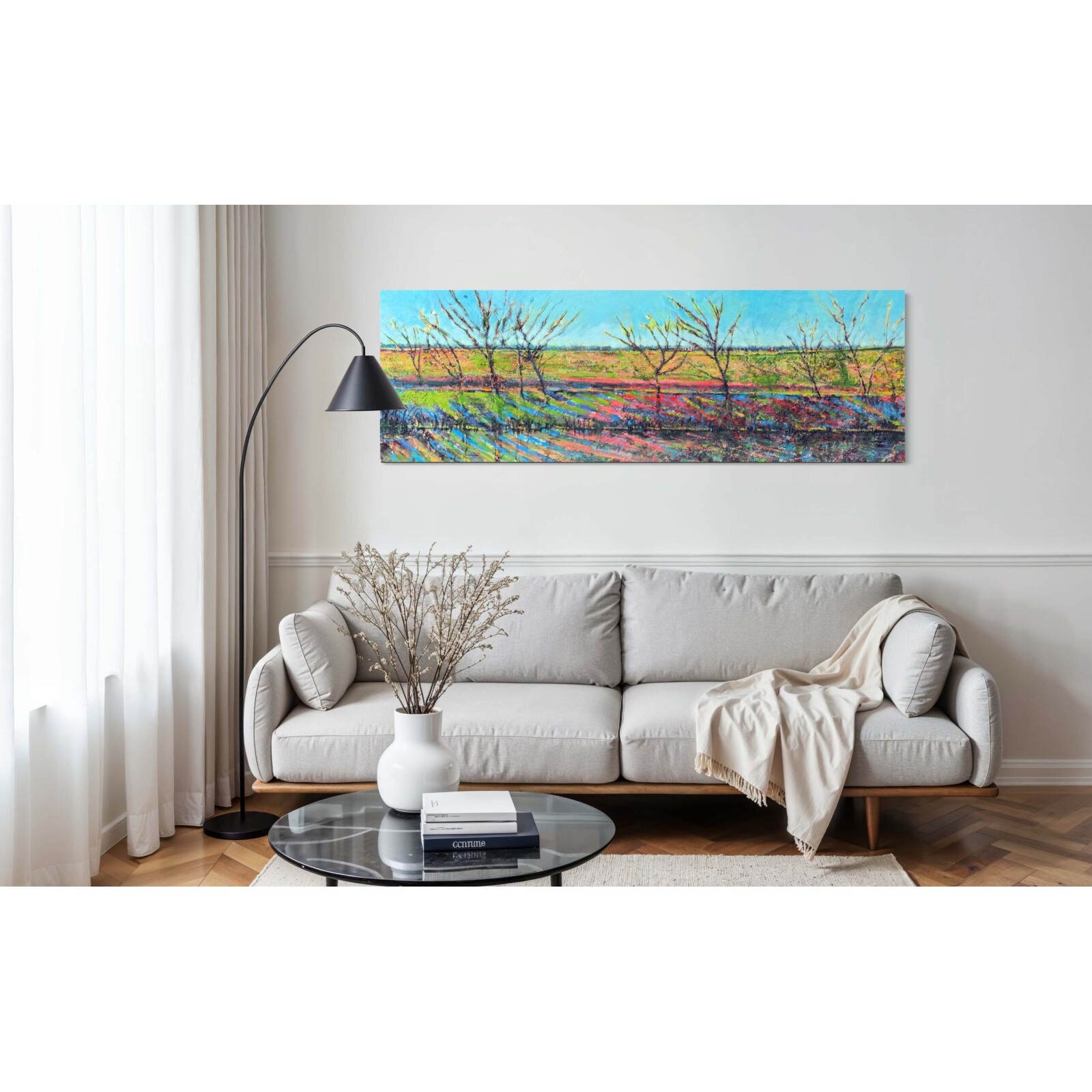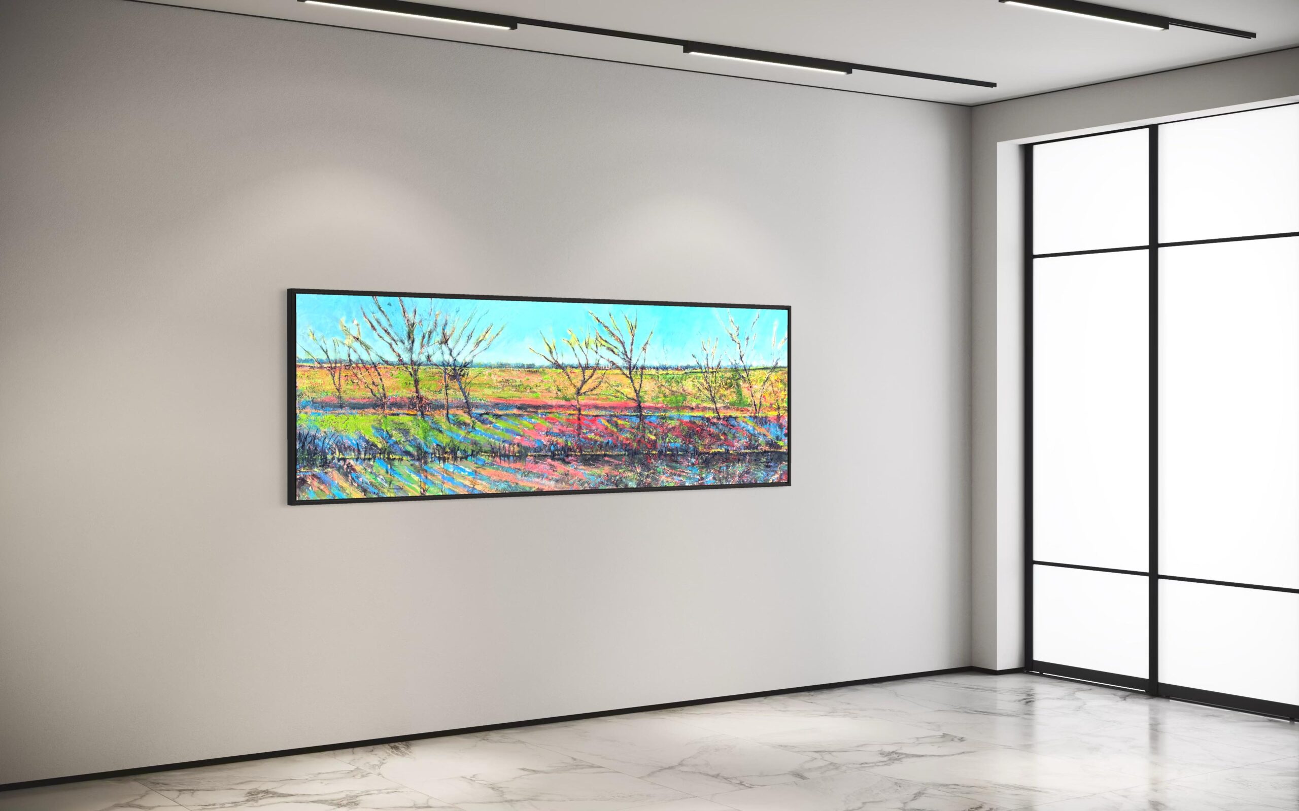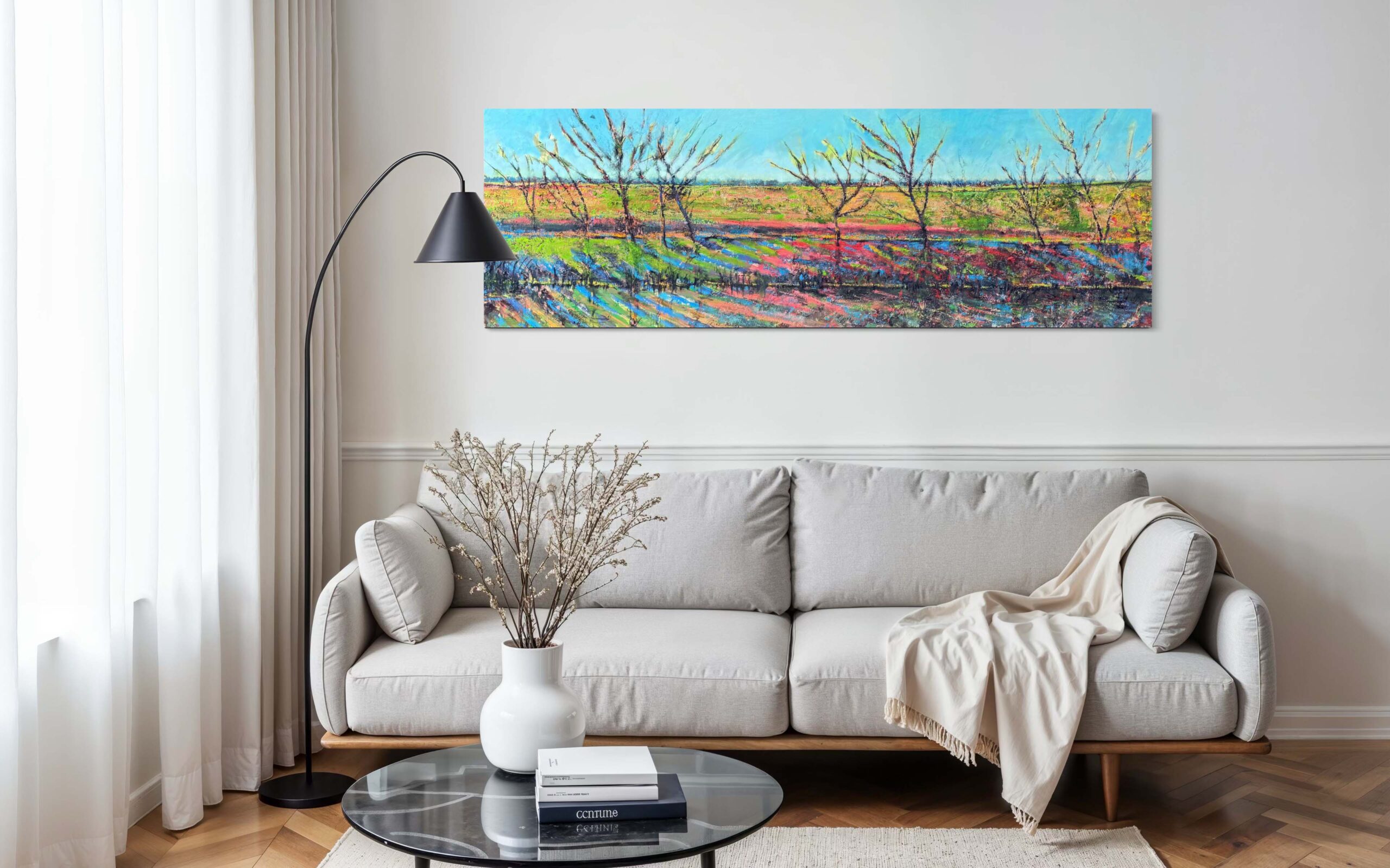 Eemzicht is een prachtig schilderij van Amersfoort van John Konijn. Het kunstwerk is opgezet met dikke lagen olieverf (zie detail-foto’s). Het formaat van 60x180cm zorg voor een echte blikvanger in ieders interieur. Benieuwd naar dit kunstwerk? Kopen, huren+sparen, kunstkoopregeling, gratis proefplaatsing? Kom langs in onze galerie in Amersfoort en laat je vrijblijvend adviseren over de mogelijkheden omtrent dit kunstwerk.