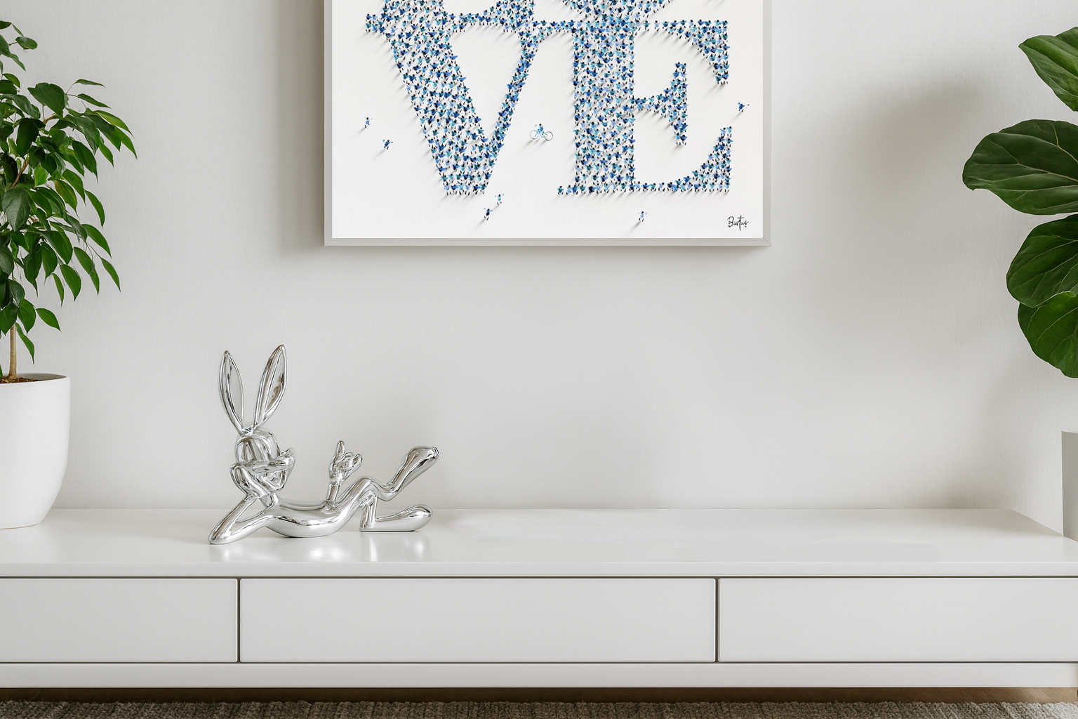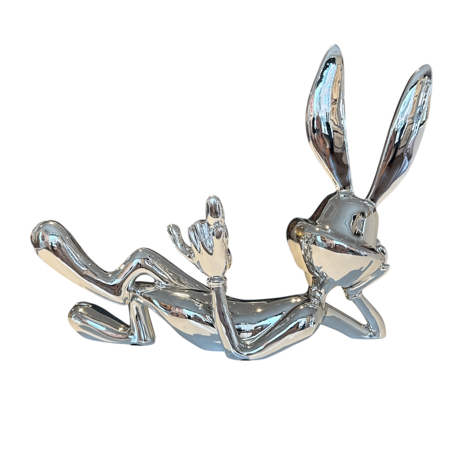 Het beeld Lazy Bunny is gemaakt van verchroomd polystone, wat zorgt voor een duurzame en hoogwaardige afwerking. De chromen afwerking geeft het beeld een moderne en futuristische uitstraling, perfect passend in elk interieur.