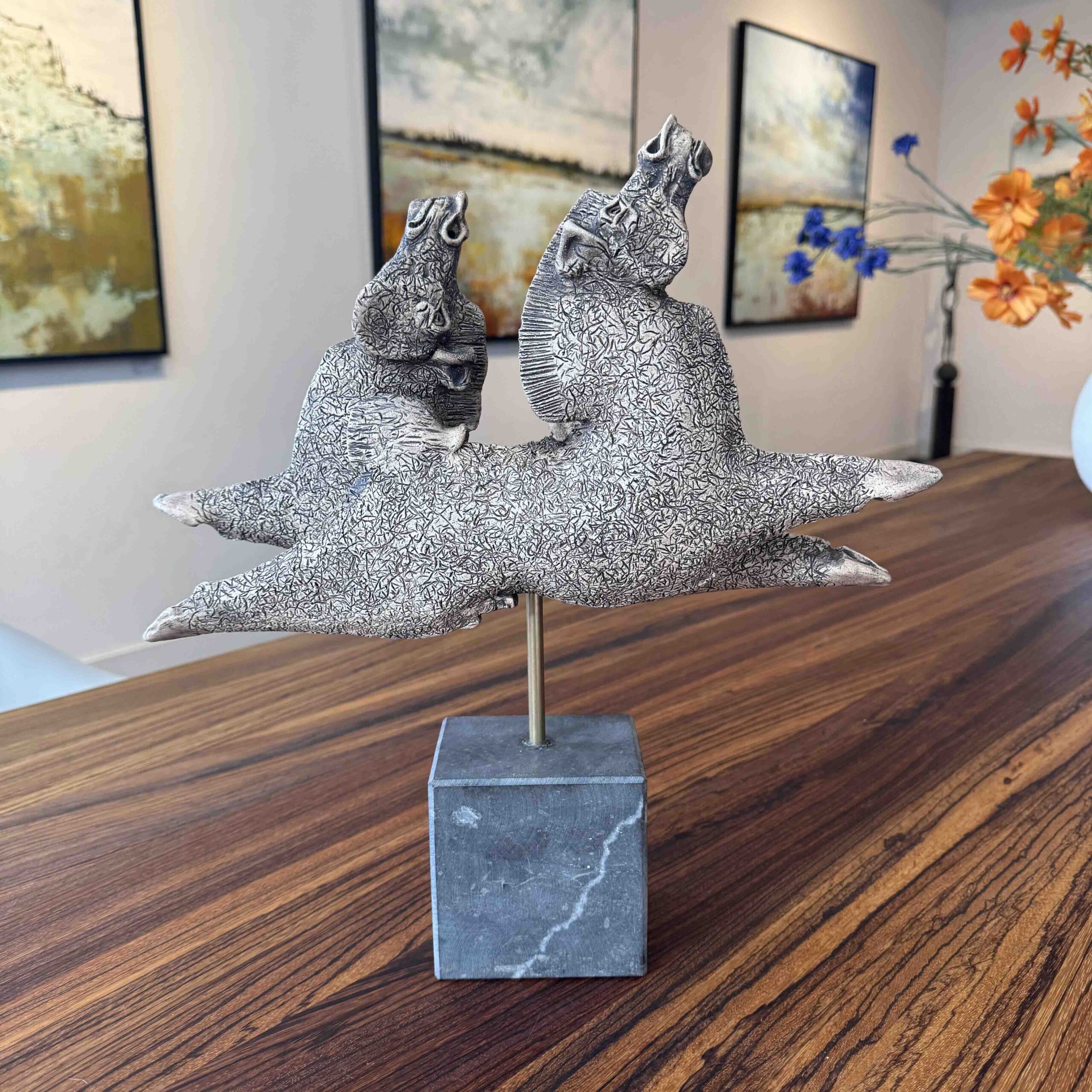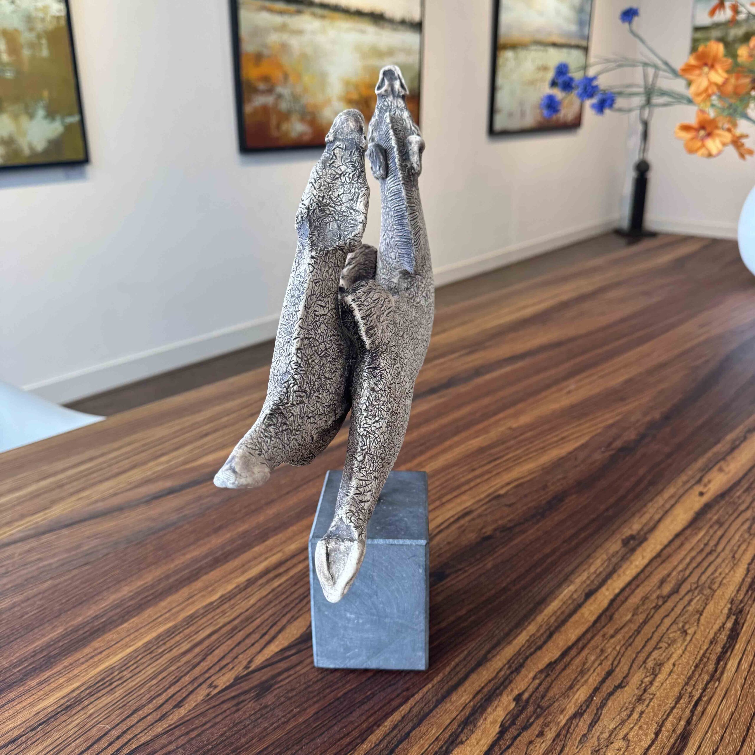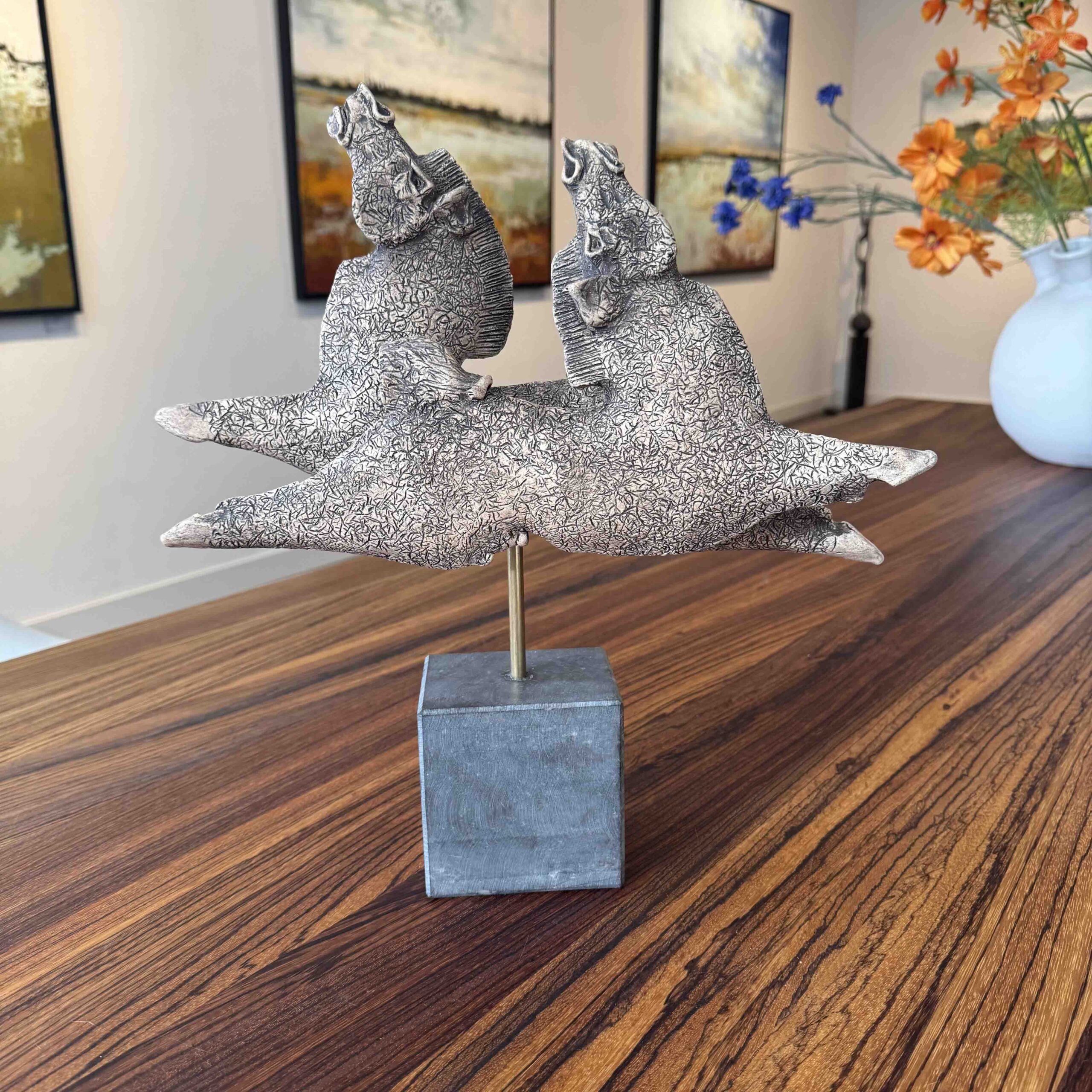 Zeer mooi origineel beeld van twee dansende paarden van de befaamde kunstenaar Lei Hannen, uiteraard een uniek exemplaar. Het beeld is bevestigd op een natuurstenen sokkel (totale hoogte 39 cm) en wordt geleverd met certificaat van echtheid. Te zien in onze galerie in Amersfoort en ook online te bestellen. De levertijd bedraagt ongeveer 1-3 werkdagen.