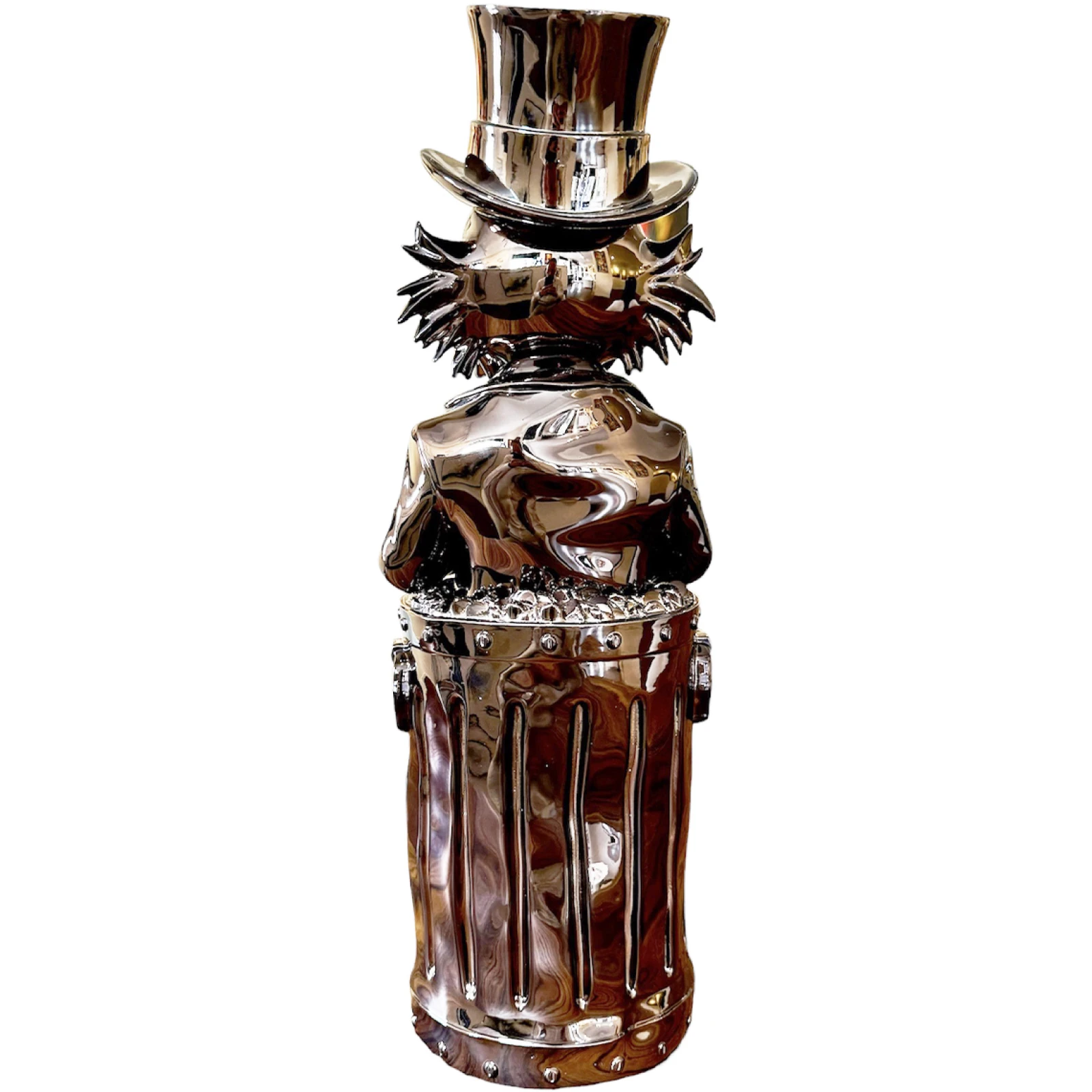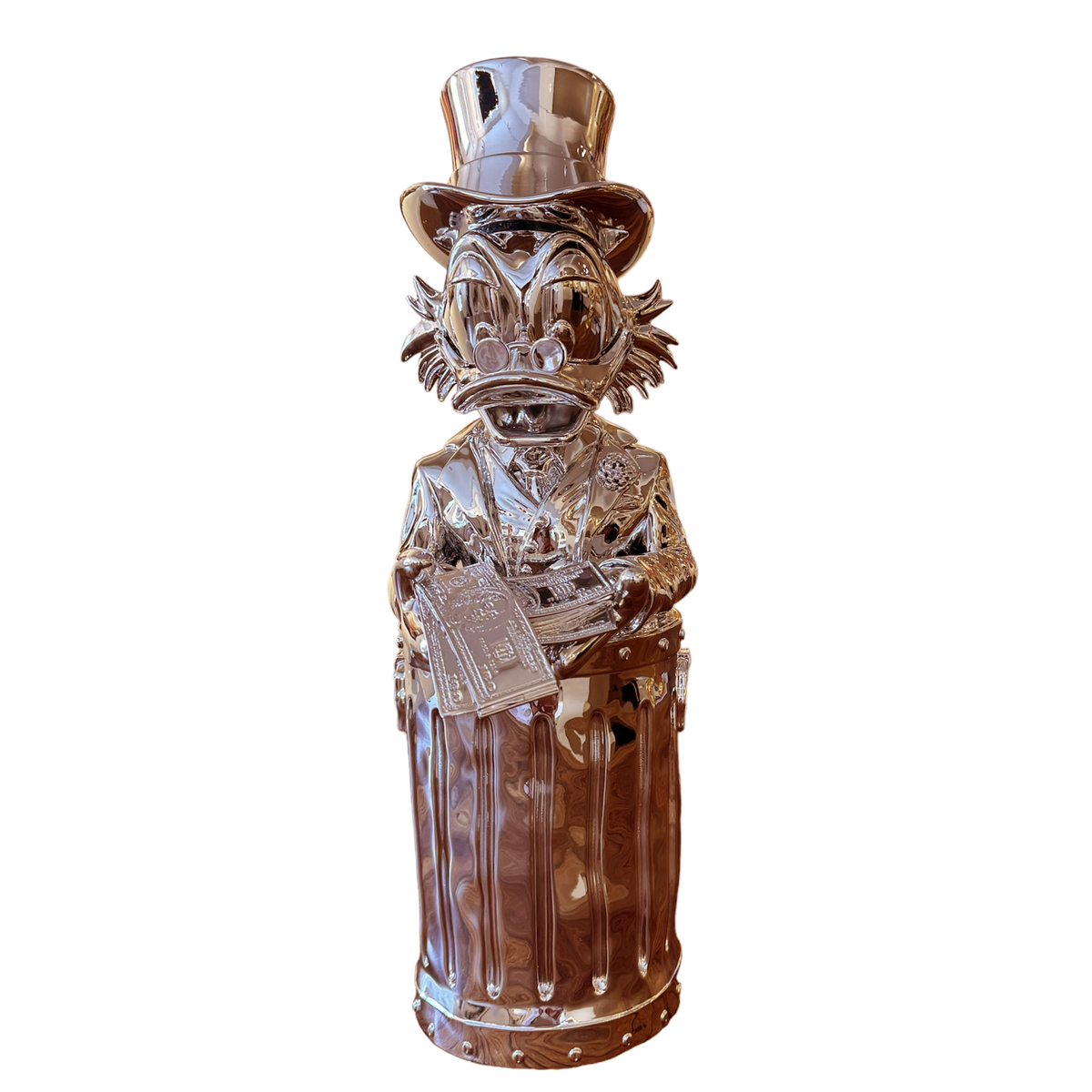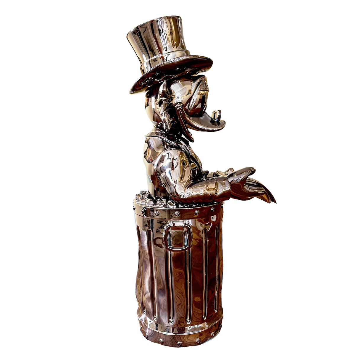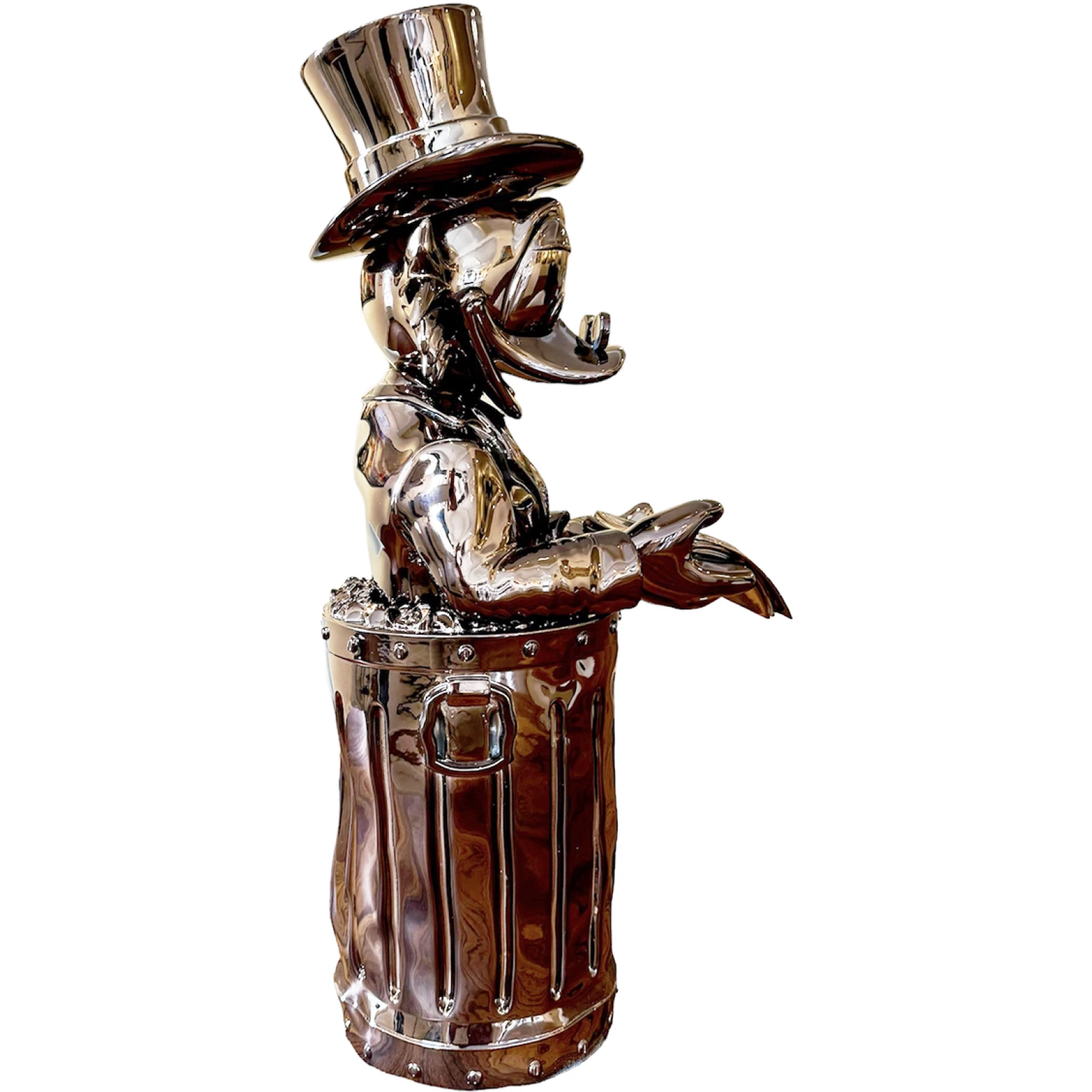 ‘Dollar Duck Rosé’ is een uniek PopArt beeld van Martin de Noir. Met de iconische Dagobert Duck, beroemd om zijn liefde voor rijkdom, portretteert dit beeld hem in een ongewone setting: zittend in de prullenbak van Oscar uit Sesamstraat, met honderddollarbiljetten in zijn handen. Gemaakt van hoogwaardig polystone en minutieus gedetailleerd, combineert het stuk elementen van luxe met een speelse twist.