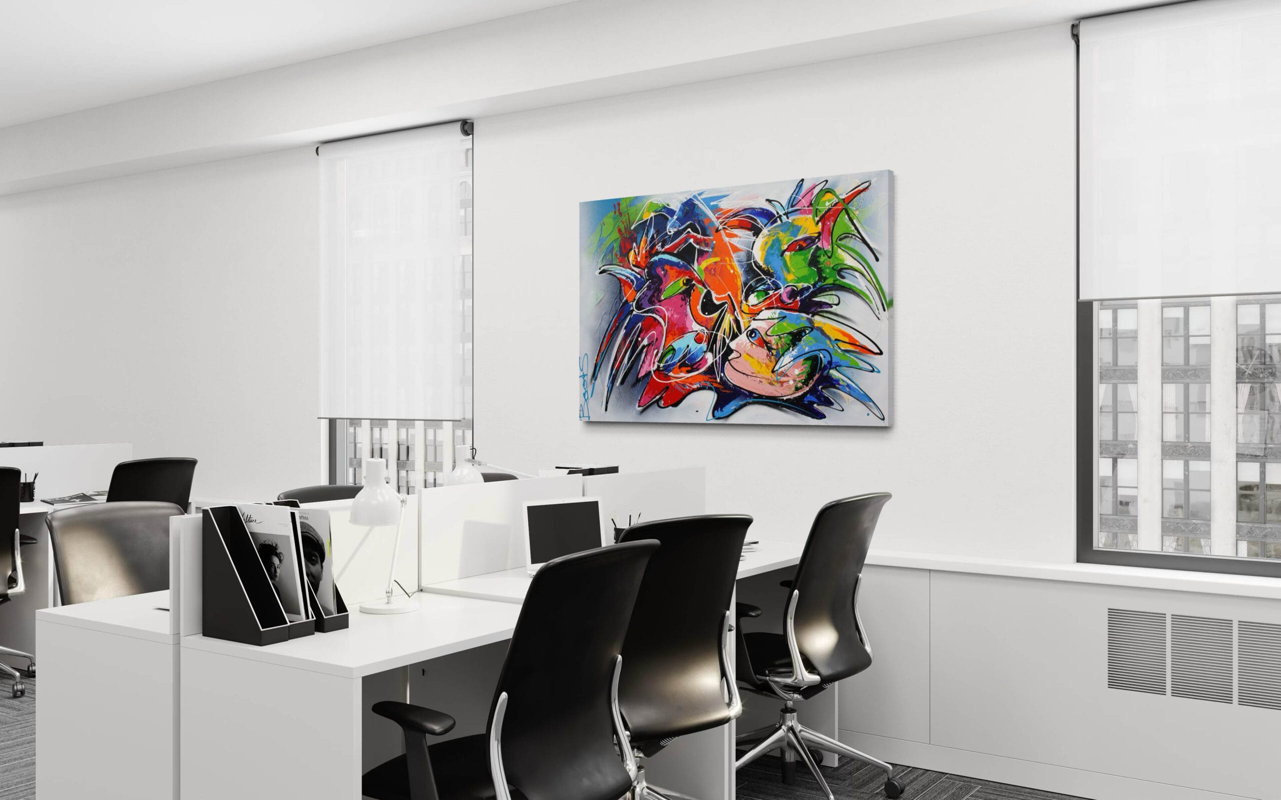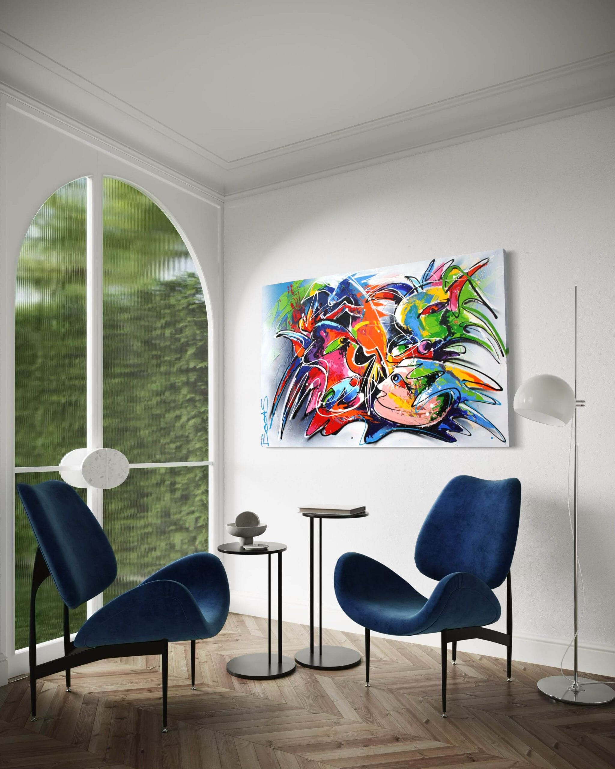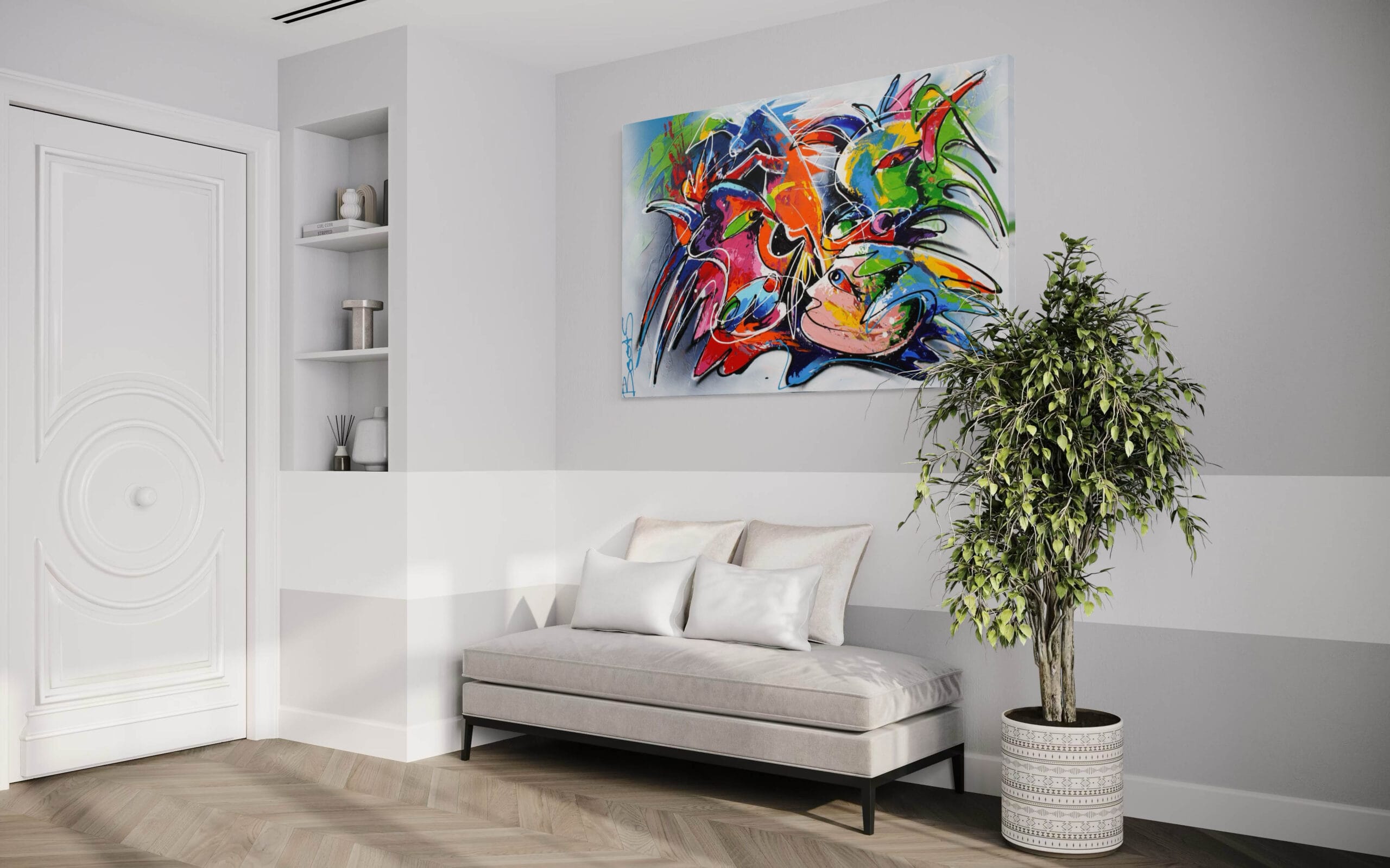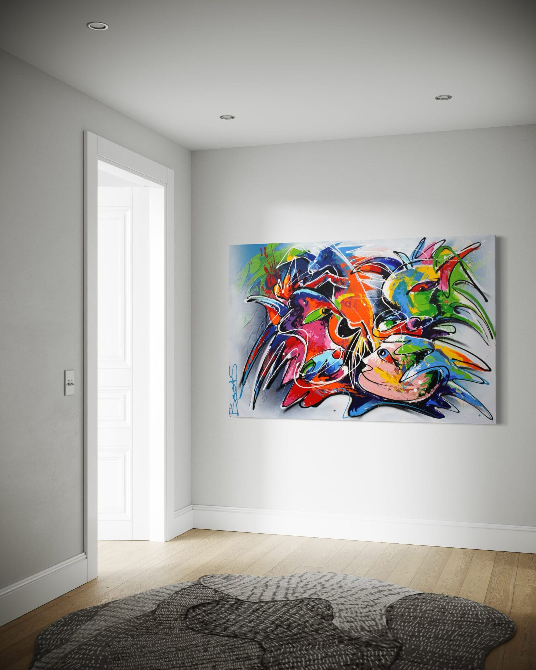 Prachtig kunstwerk van Sandra Boots. Dit kunstwerk swingt! Met een formaat van 100 x 150cm en geschilderd op een dik frame van 5cm is dit een echte eye-catcher! De felle acrylkleuren zijn overgoten met een dikke laag glanzend vernis zodat de kleuren nog meer tot leven komen! Het unieke schilderij komt uiteraard met een certificaat van echtheid. Te zien in onze galerie en ook beschikbaar in onze Kunstuitleen. Wegens wisseling van de collectie bieden wij dit kunstwerk tijdelijke aan voor een hele scherpe prijs!