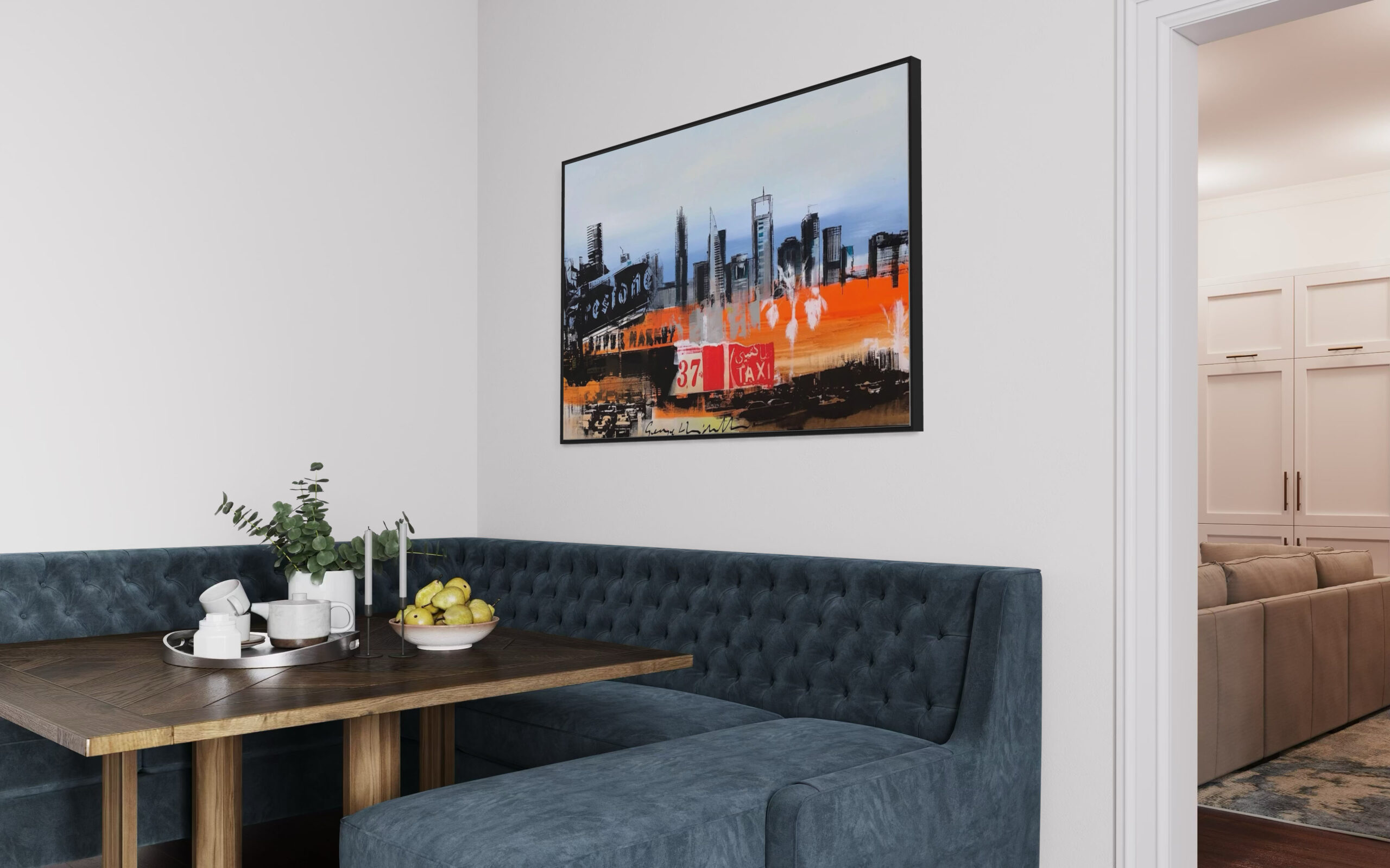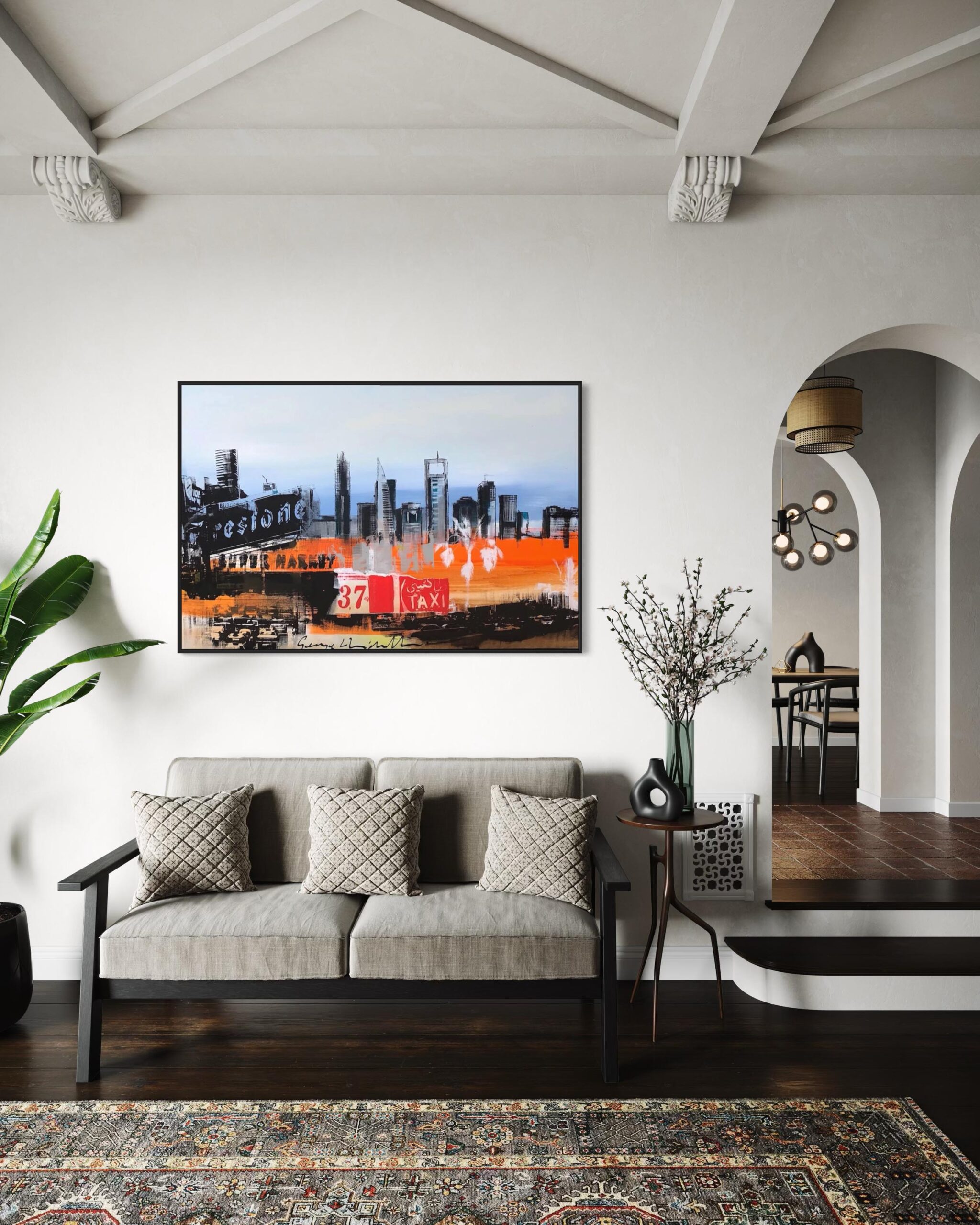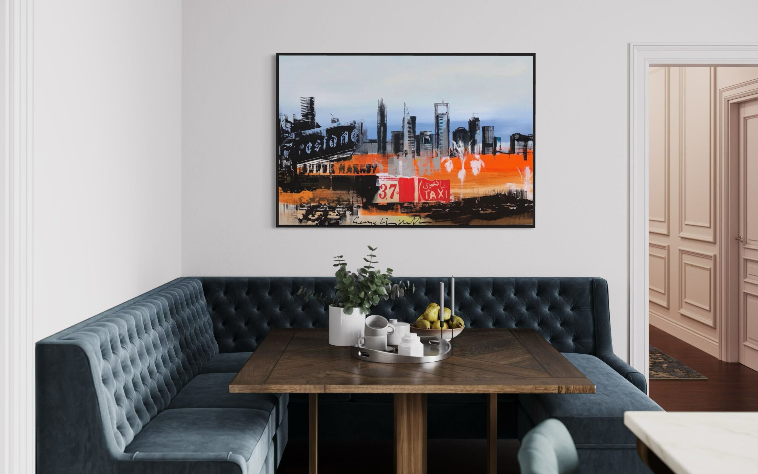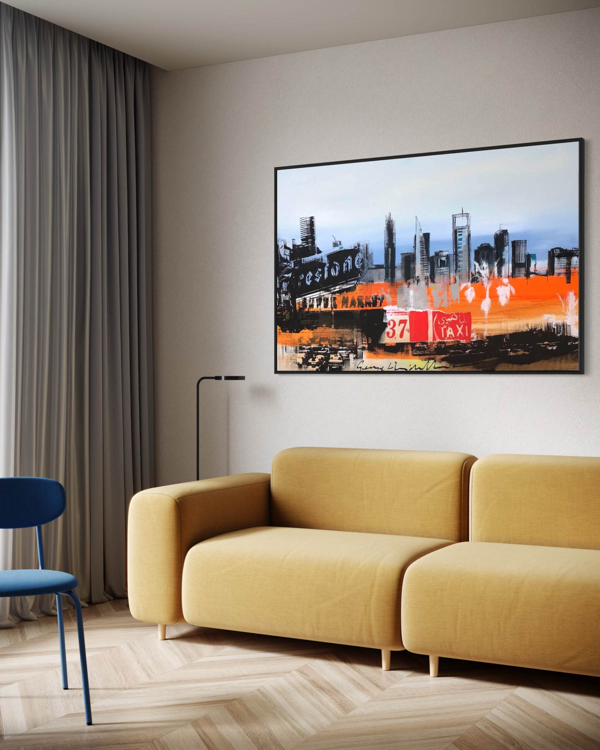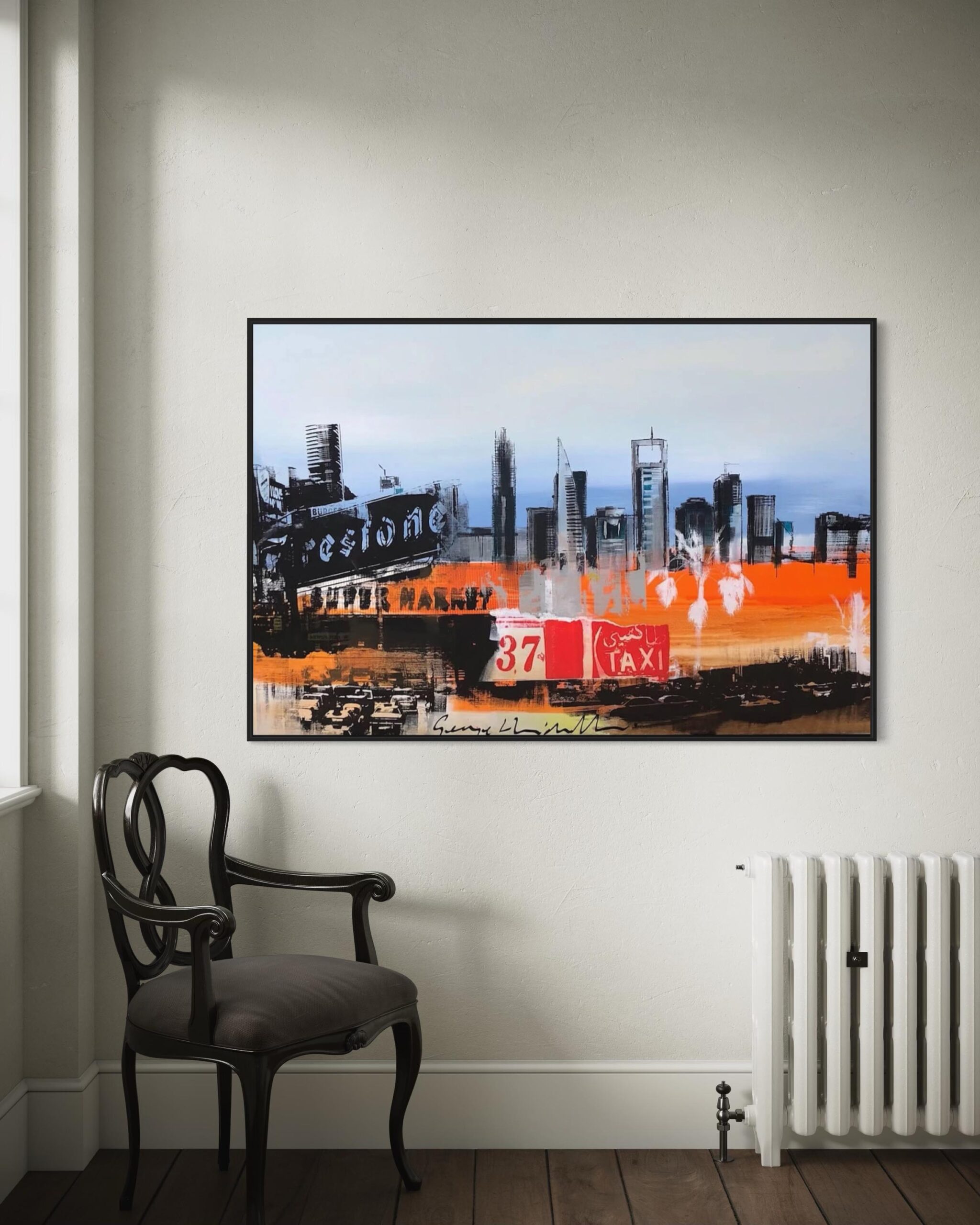 Gaaf schilderij "Dubai Skyline" van de gerenommeerde kunstenaar George Heidweiller. Dit grote en prachtige stuk is geschilderd op hoogwaardig linnen met acrylverf en diverse sjabloontechnieken. Het kunstwerk kan optioneel worden geleverd met een stijlvolle zwarte of zwart/zilveren baklijst, waardoor het een echte blikvanger is in elke ruimte. Ons laatste werk van George Heidweiller en vandaar voor een hele speciale prijs!