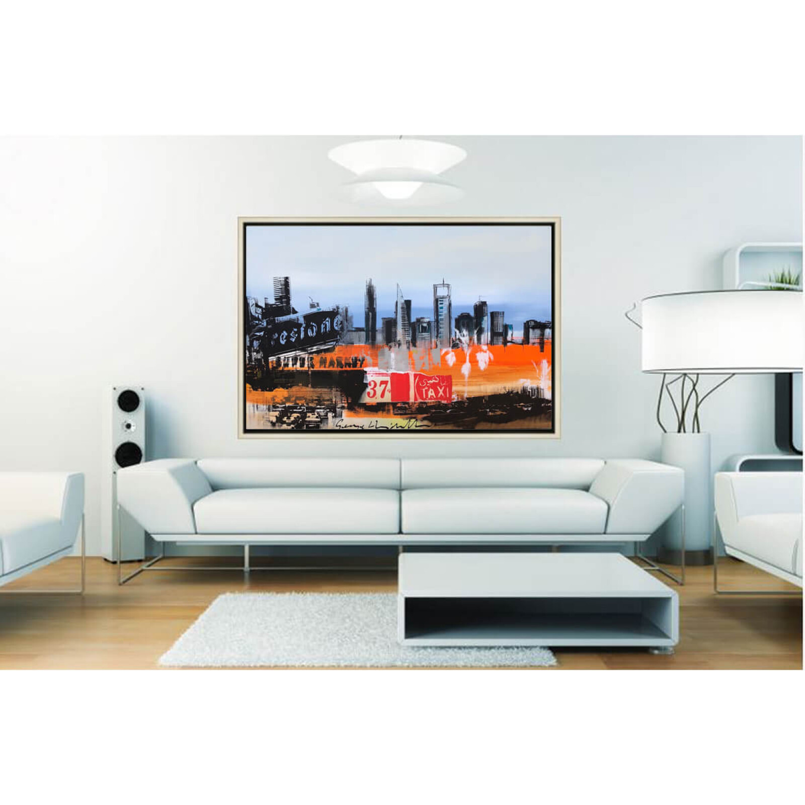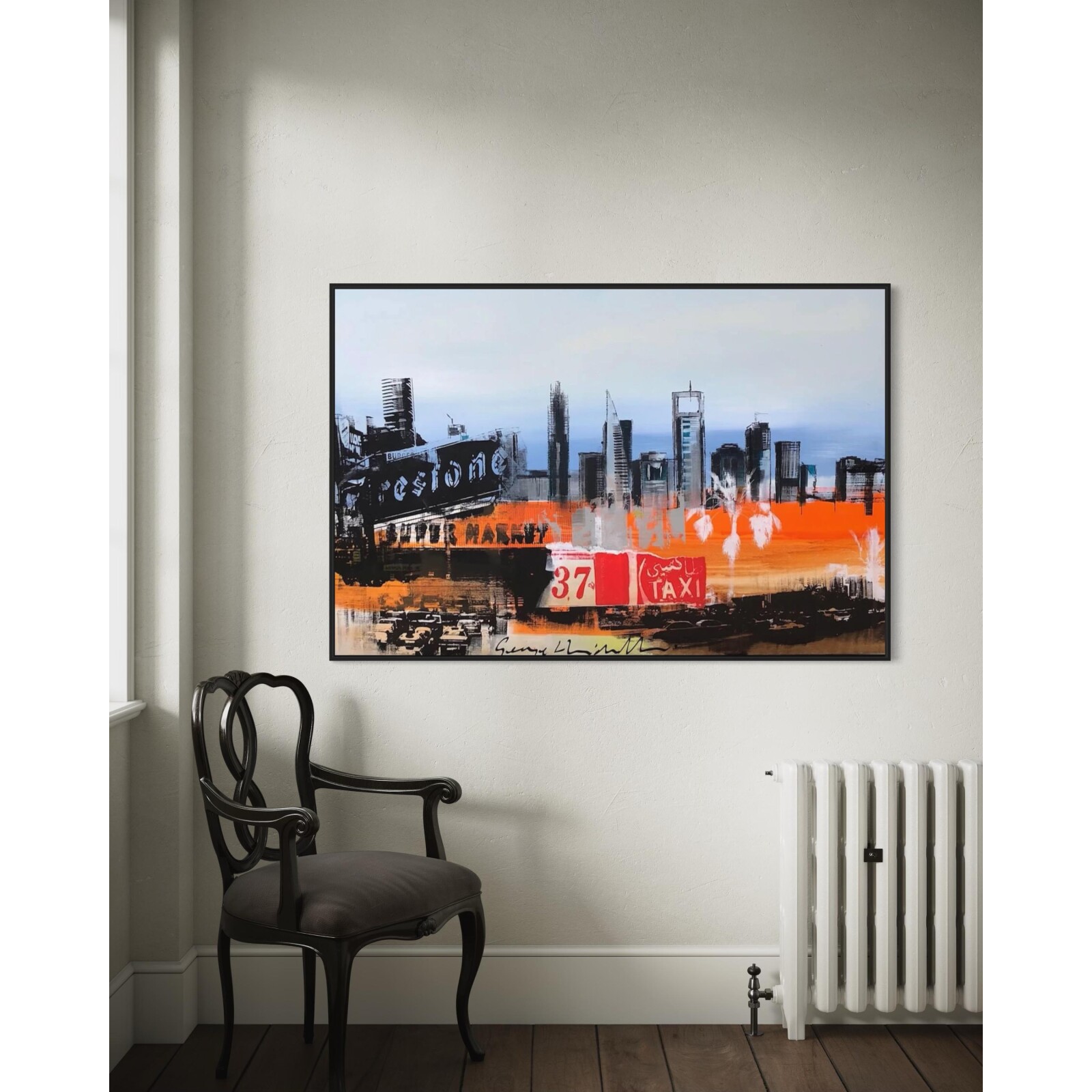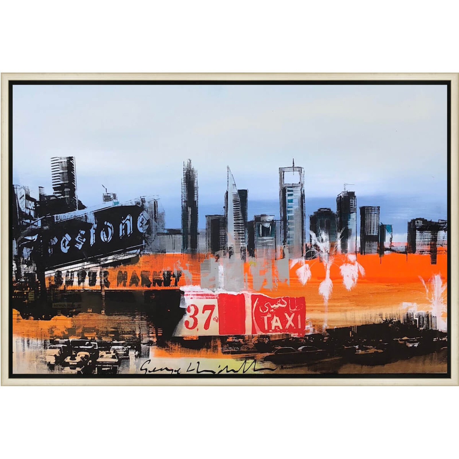 Gaaf schilderij "Dubai Skyline" van de gerenommeerde kunstenaar George Heidweiller. Dit grote en prachtige stuk is geschilderd op hoogwaardig linnen met acrylverf en diverse sjabloontechnieken. Het kunstwerk kan optioneel worden geleverd met een stijlvolle zwarte of zwart/zilveren baklijst, waardoor het een echte blikvanger is in elke ruimte. Ons laatste werk van George Heidweiller en vandaar voor een hele speciale prijs!