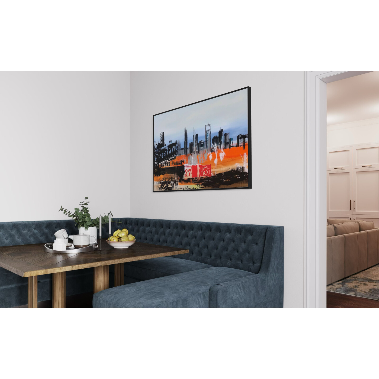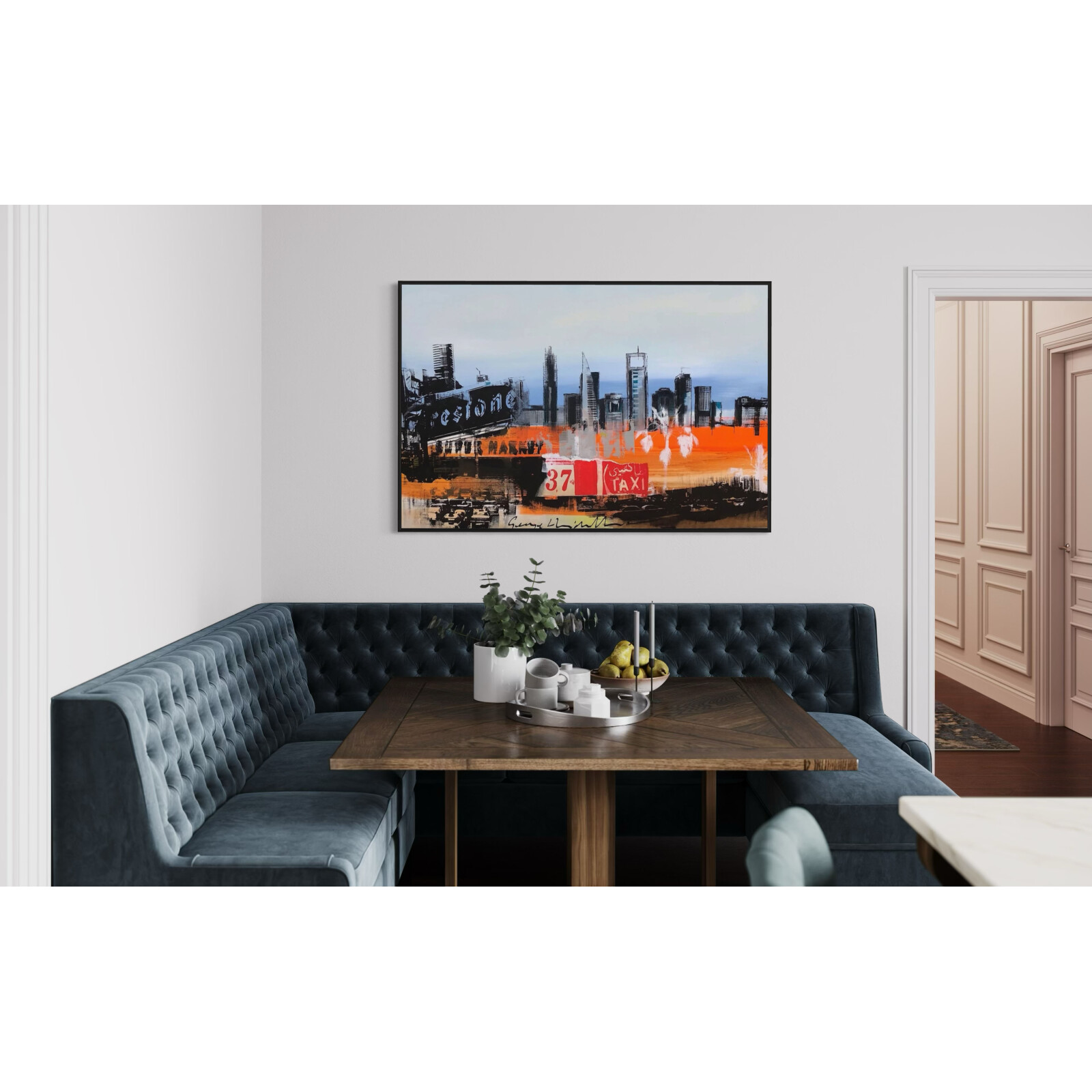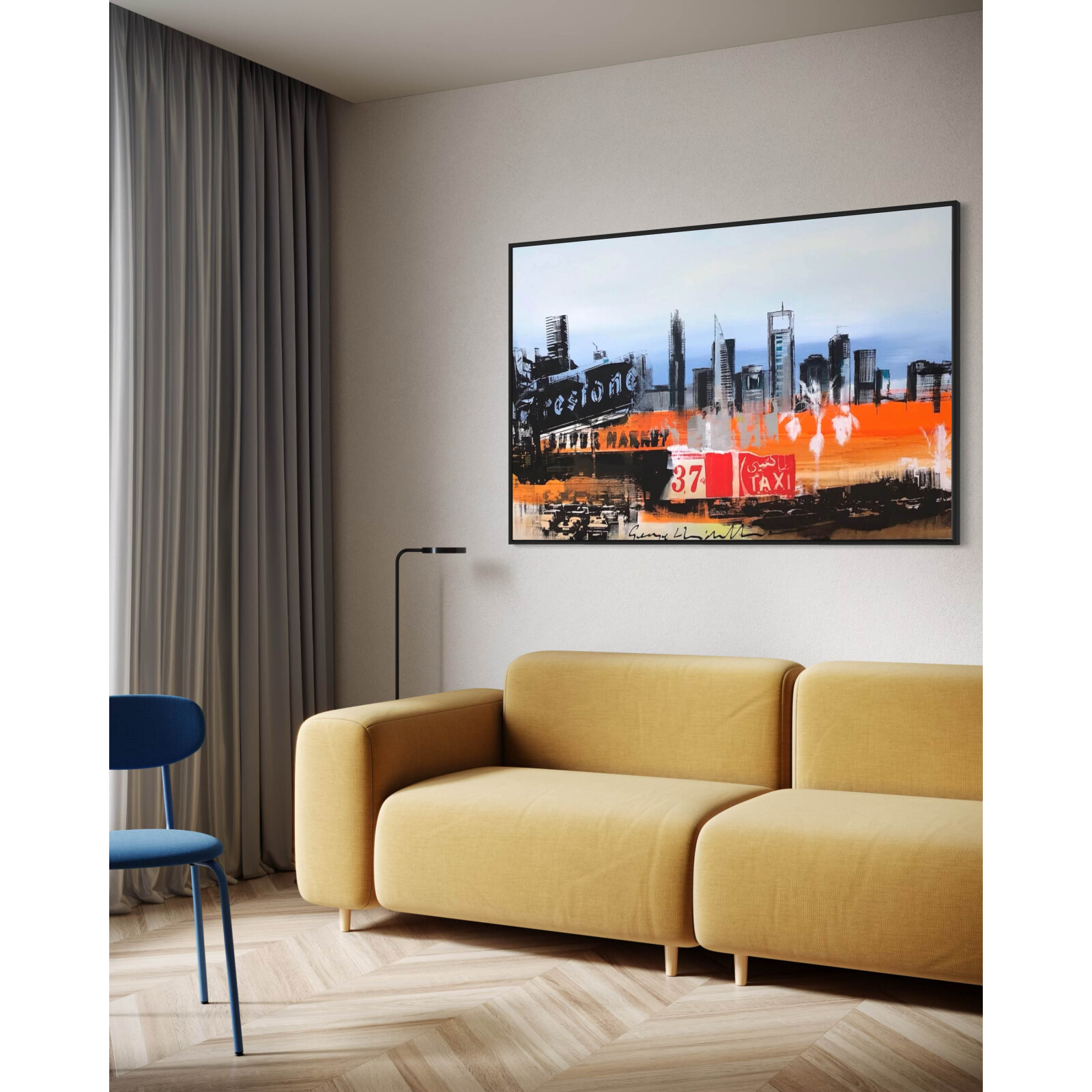 Gaaf schilderij "Dubai Skyline" van de gerenommeerde kunstenaar George Heidweiller. Dit grote en prachtige stuk is geschilderd op hoogwaardig linnen met acrylverf en diverse sjabloontechnieken. Het kunstwerk kan optioneel worden geleverd met een stijlvolle zwarte of zwart/zilveren baklijst, waardoor het een echte blikvanger is in elke ruimte. Ons laatste werk van George Heidweiller en vandaar voor een hele speciale prijs!