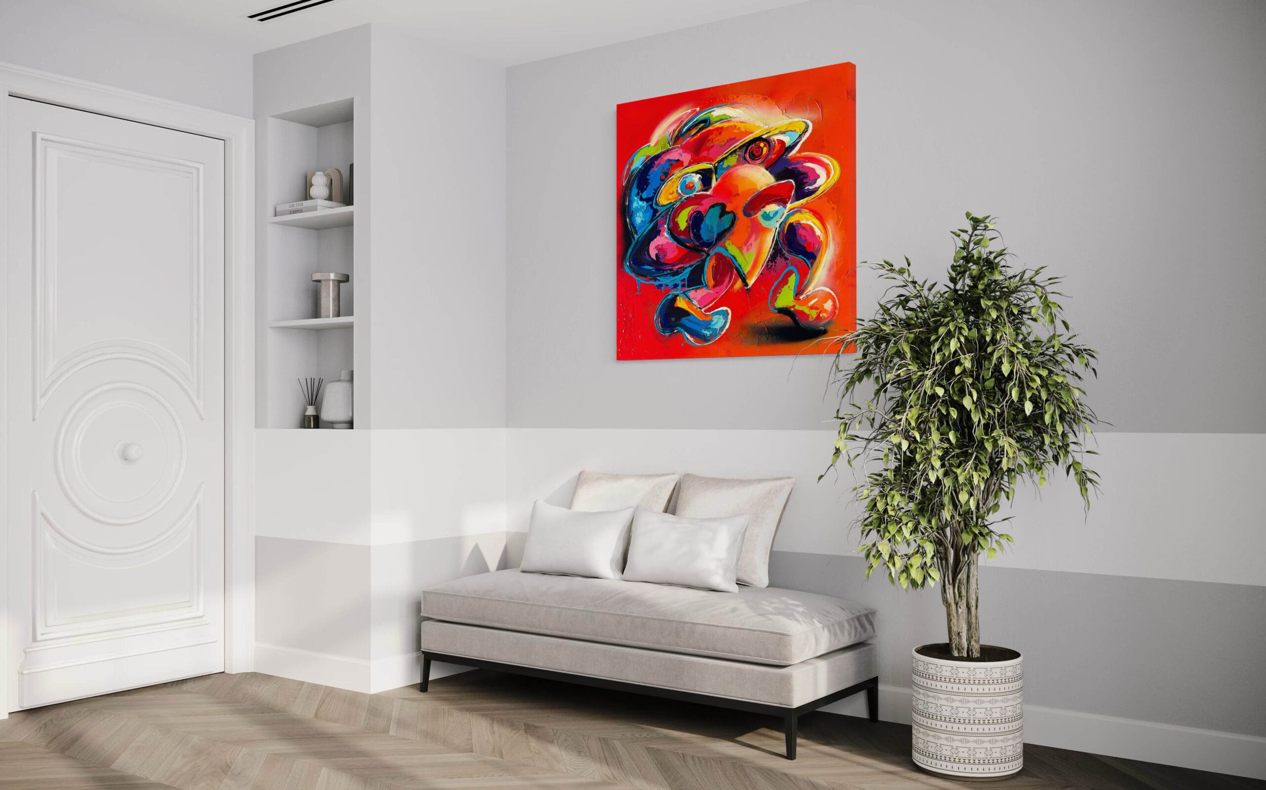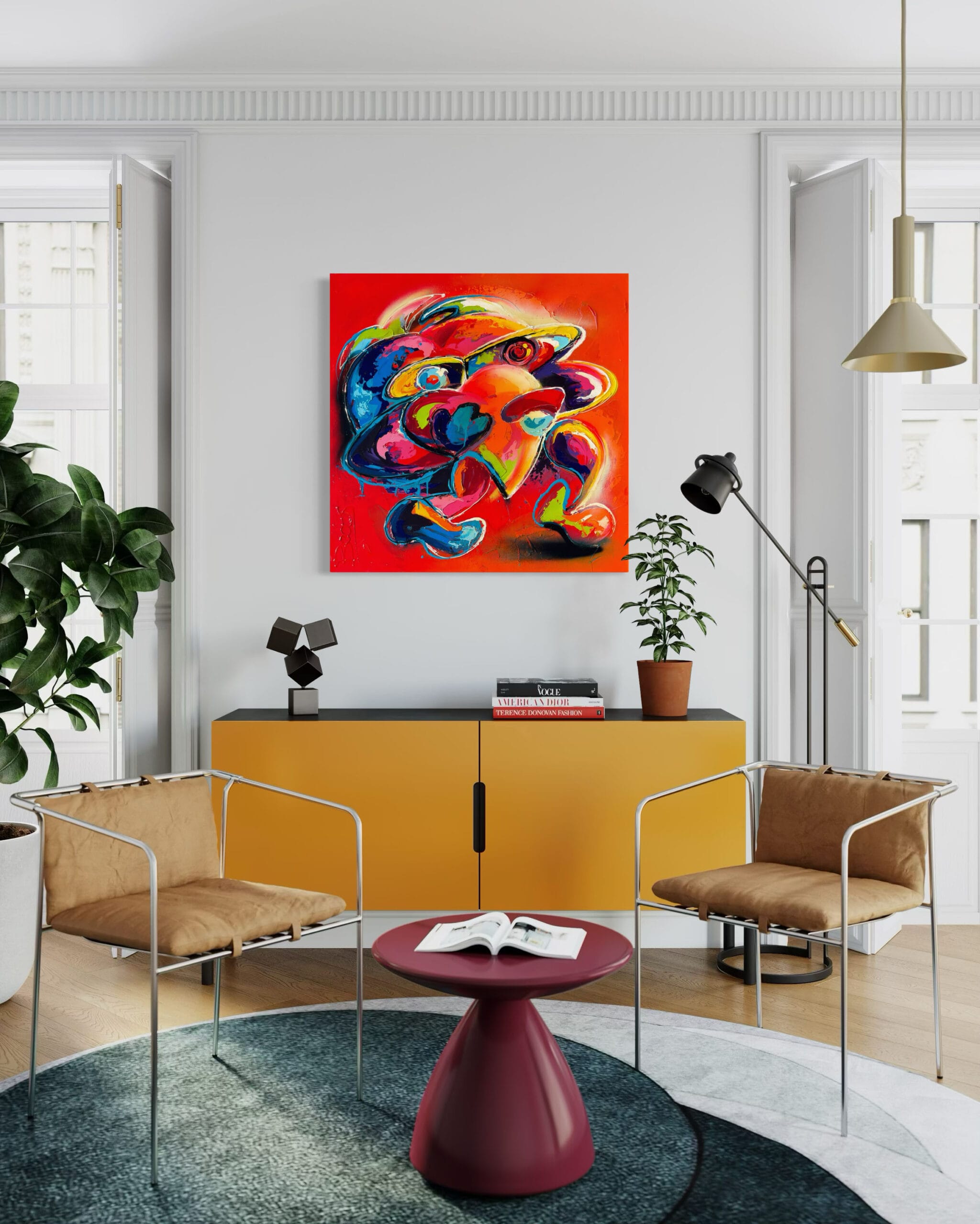 Prachtig kunstwerk van Sandra Boots. Dit kunstwerk swingt! Met een formaat van 100 x 100cm en geschilderd op een dik frame van 5cm is dit een echte eye-catcher! De felle acrylkleuren zijn overgoten met een dikke laag glanzend vernis zodat de kleuren nog meer tot leven komen! Het unieke schilderij komt uiteraard met een certificaat van echtheid. Te zien in onze galerie en ook beschikbaar in onze Kunstuitleen. Wegens wisseling van de collectie bieden wij dit kunstwerk tijdelijke aan voor een hele scherpe prijs!